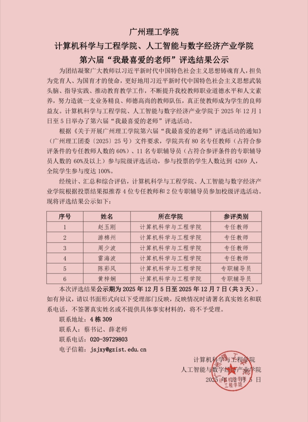 为团结凝聚广大教师以习近平新时代中国特色社会主义思想铸魂育人,担负为党育人、为国育才的使命,更好地用习近平新时代中国特色社会主义思想武装头脑、指导实践、推动教育教学工作,不断提升我校教师职业道德水平和人文素养,努力造就一支业务精良、师德高尚的教师队伍,真正使教师成为学生的良师益友。我校开展了广州理工学院第六届“我最喜爱的老师”评选活动,计算机科学与工程学院&人工智能与数字经济产业学院根据投票结果拟推荐4位专任教师和2位专职辅导员参加校级评选活动。